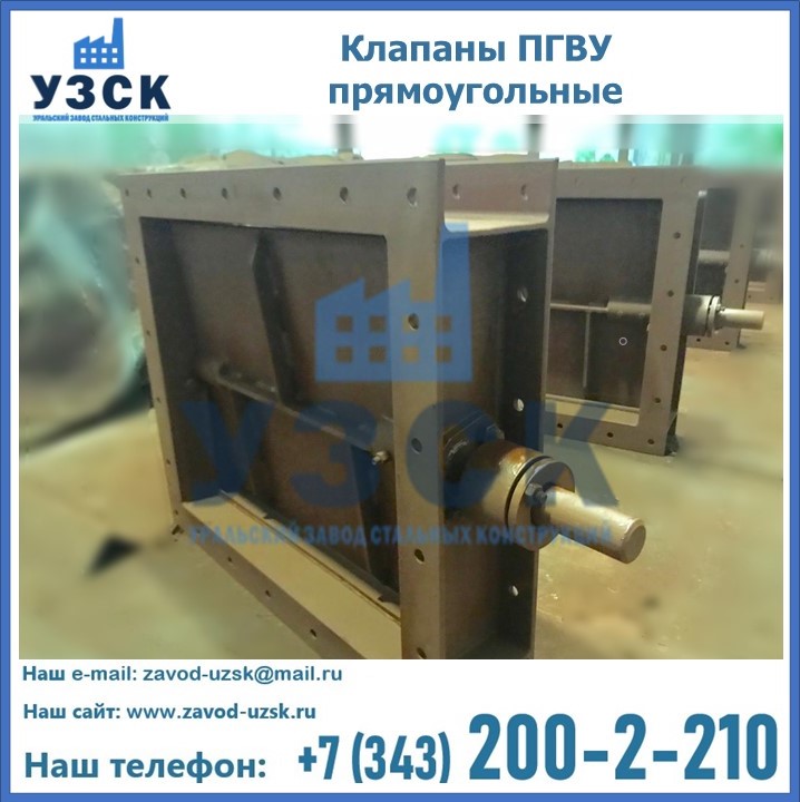 Прямоугольный клапан ПГВУ имеет прямоугольную или квадратную форму, по основному сечению конструкции, на которую устанавливается клапан. Для изготовления в Темиртау применяются сталь или чугун, в зависимости от модели. Внутри клапана имеется запорный элемент, передвигающийся параллельно общему потоку движения среды. Шибер ПГВУ имеет такую же форму, как и основное сечение. Перемещение створки происходит благодаря возвратно-поступательным движениям.
