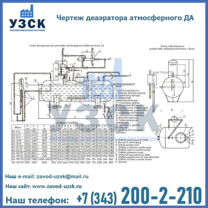 Приобрести качественное оборудование, в том числе, деаэраторы ДА, можно в компании УЗСК в Темиртау. Мы предлагаем долговечную и надежную продукцию по приемлемой цене. Заказать и купить деаэраторы или другие изделия высокого качества можно через сайт Уральского Завода Стальных Конструкций, или позвонив по указанному в разделе «Контакты» телефону.